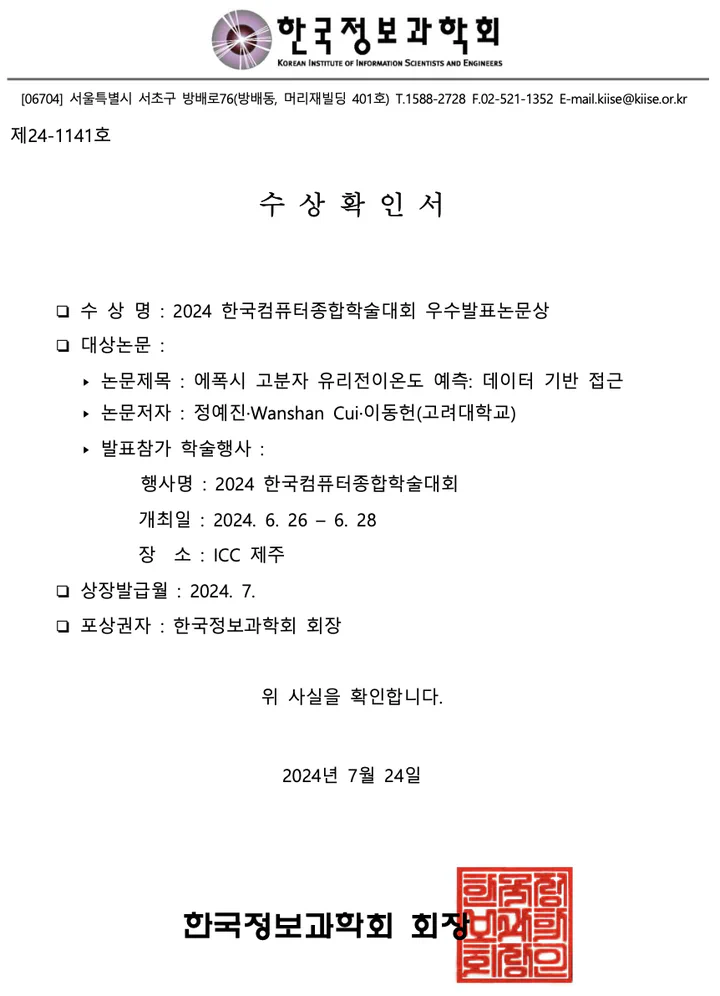 We are thrilled to announce that two of our students from the AIML@K program have been awarded the prestigious Best Paper Award at Korea Computer Congress (KCC; 한국컴퓨터종합학술대회) 2024. This remarkable achievement highlights their exceptional research and dedication into their award-winning paper, titled “A Data-driven Approach for Predicting Glass Transition Temperature of Epoxy Polymers”.