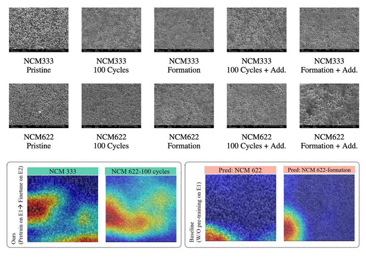 Scanning Electron Microscopy (SEM) imaging offers a powerful yet underutilized tool for diagnosing the state of lithium-ion battery cathodes. However, deep learning models for SEM-based state prediction often suffer from limited training data and domain shifts, particularly when functional electrolyte additives are introduced. In this work, we propose a two-stage transfer learning framework using an EfficientNet-B0 backbone to robustly classify cathode SEM images across nine classes defined by material composition (NCM333, NCM622, NCM811) and aging state (pristine, formation-aged, 100 cycles). Our method first pretrains the model on a data-rich source domain of additive-free samples, then fine-tunes it on a smaller target domain containing additive-induced variations. To address class imbalance, we compare targeted oversampling and weighted loss strategies. Experimental results show that our framework consistently outperforms pretraining-only and fine-tuning-only baselines, achieving over 0.98 accuracy and F1 scores for domain-shifted classes. Qualitative analysis using Grad-CAM further confirms that the model captures physically meaningful features, such as particle cracking and boundary degradation. These findings demonstrate the effectiveness of transfer learning in reducing data scarcity and domain shift in SEM-based battery diagnostics, providing a practical solution for automated analysis in next-generation battery development.